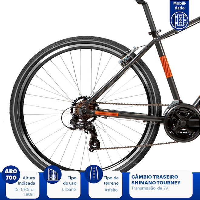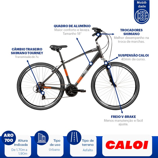 Versátil e ideal para as pedaladas urbanas, essa Bicicleta Caloi 700 possui câmbios Shimano e freios resistentes V-Brake em alumínio, que garantem máxima segurança durante as pedaladas. Uma ótima opção para você curtir os momentos de lazer, a Bike tem 21 Marchas para treinos personalizados e selim altamente confortável com quick release, que permite o ajuste da altura. Com guidão mais alto, essa Bicicleta Caloi tem quadro em alumínio e aro 700 para perfomance ágeis e seguras.