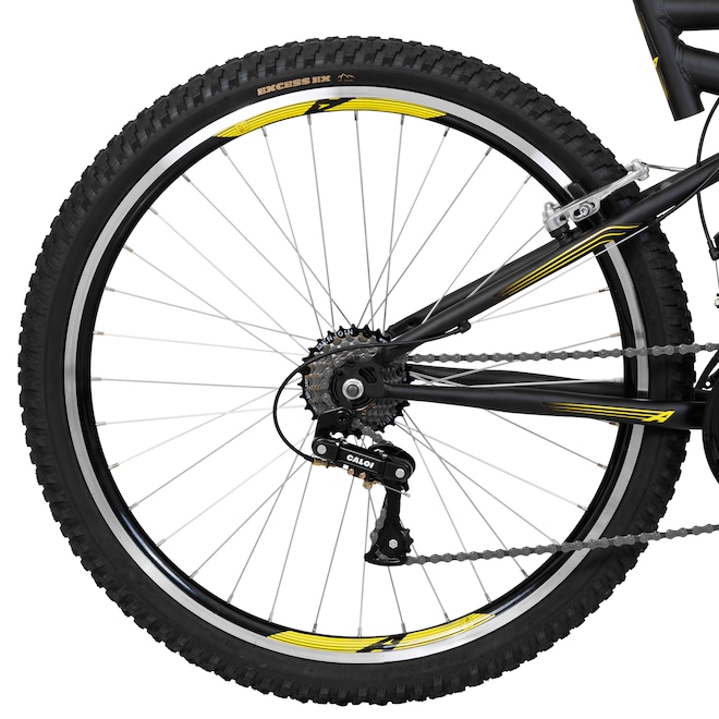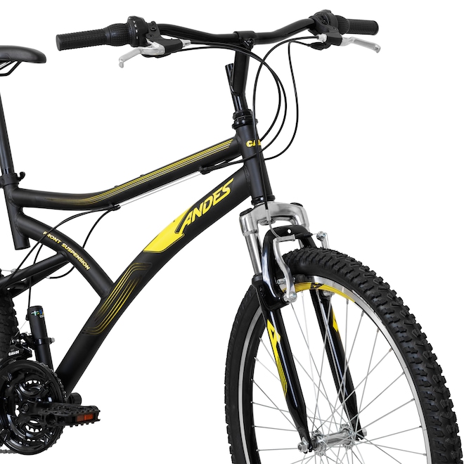 A suspensão dianteira proporciona mais conforto nas irregularidades do solo e os aros com parede dupla aumentam a resistência.