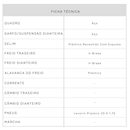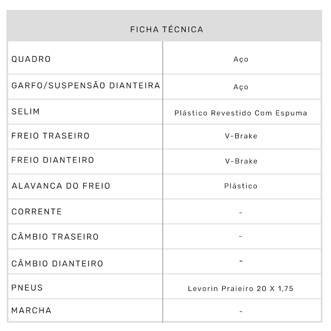 Tipo Passeio Ocasião de Uso Lazer / Mobilidade Gênero Infantil Faixa Etária Infantil Aro 20 Alavanca do Freio Plástico Freio Dianteiro V-Brake Freio Traseiro V-Brake Manopla Smart Ride Quadro Aço Garfo/Suspensão Dianteira Aço Cubo Aço Cubo Traseiro Aço Pneus Levorin Praieiro 20 x 1,75 Pedivela Aço Monobloco 140 mm Movimento Central Prensado de Aço Movimento de Direção Standard 22,2 mm Cassete/Roda Livre Roda livre 1 velocidade Selim Plástico Revestido com Espuma Guidão Aço 480 x 100 mm Mesa/Suporte do Guidão Aço 60mm Peso Máximo Suportado (kg) 40 Garantia do Fornecedor 2 anos no Quadro