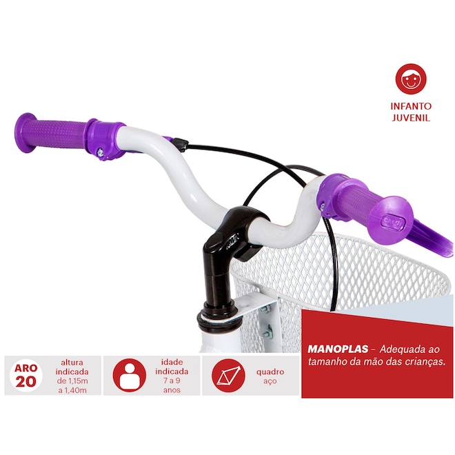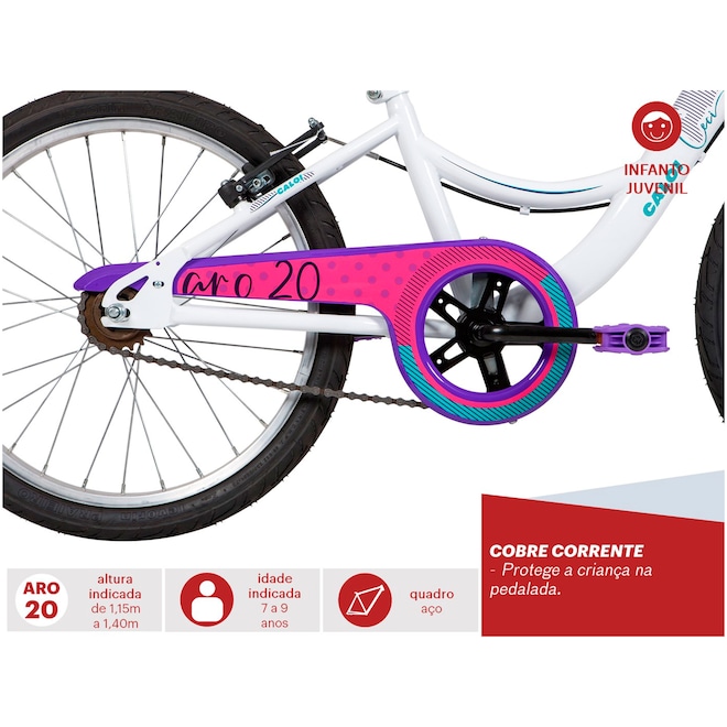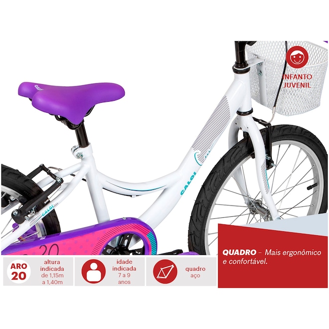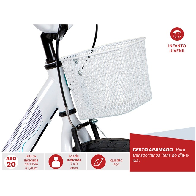 Clássica, a nova Ceci aro 20 apresenta um design modificado e ergonômico para a criançada se divertir à vontade com muito mais conforto e estabilidade nas pedaladas. Resistente, o quadro da Ceci T12 Aro 20 é em aço com manoplas anatômicas Smart Ride, adequadas ao tamanho das mãos dos pequenos. O cobre-corrente da Ceci Aro 20 é estiloso e garante a proteção dos pequenos nos percursos. Já os freios da Bicicleta Caloi Ceci Aro 20 são V-Brake que conferem maior segurança nas paradas bruscas. E para completar o conforto e charme da Caloi Ceci 20, o cesto aramado permite transportar os itens nos passeios. Indicada para as crianças entre 7 a 9 anos, a Bicicleta Caloi Ceci 20 é um excelente presente para as crianças que estão prontas para pedalar sem o auxílio das rodinhas. Não perca a chance e proporcione ótimos e relaxantes momentos para os baixinhos com a qualidade Caloi. Aproveite o preço e compre já!