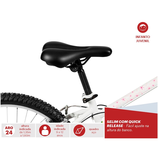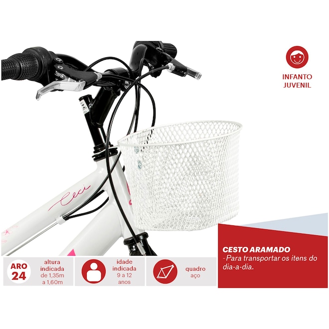 Com a qualidade Caloi notada em cada detalhe dessa Bicicleta Infantil, a Ceci Aro 24 é a opção ideal para as meninas modernas e fashions que adoram pedalar pelos parques e ciclovias com estilo e personalidade. Indicada para crianças entre 9 a 12 anos com altura entre 1,35 a 1,60 metros, a Bicicleta Caloi Ceci apresenta quadro resistente em aço e seu freio V-Brake em alumínio, oferece durabilidade e segurança nas freadas. O selim da Caloi Ceci com Quick Release é confortável e de fácil ajuste na regulagem de altura. Além disso, o cesto aramado que acompanha a bike, facilita transportar os itens com muita praticidade. Não perca a oportunidade e escolha a sua Caloi através do conteúdo especial que exemplifica detalhes específicos para a compra de sua bicicleta. Confira no site!