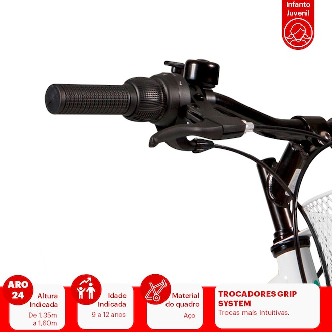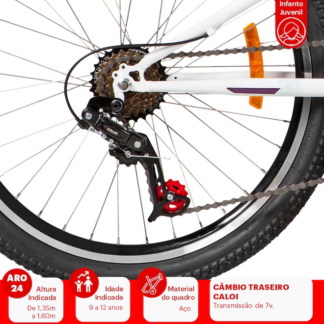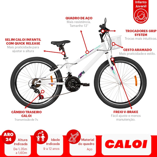 Ocasião de Uso Lazer / Mobilidade Gênero Feminino Faixa Etária Infantil Aro 24 Alavanca do Freio Plástico Freio Dianteiro V-Brake Aço Freio Traseiro V-Brake Aço Manopla Borracha Quadro Aço Aro 24 Com Suporte Para Freios V-Brake Garfo/Suspensão Dianteira Rígido de Aço Folha do Aro Alumínio Cubo Aço Cubo Traseiro Aço Pneus 24 x 2.00 Raios Inox Câmbio Dianteiro Caloi Indexado - 3v Câmbio Traseiro Caloi Indexado - 7v Passador / Alavanca de Câmbio Grip System/PVC Corrente HV-500 Pedivela Aço - com chain guard - 152mm - 42/34/24 Movimento Central B887W Cassete/Roda Livre Roda livre 07 velocidades - 14-28D Pedal Plástico Selim Caloi Infantil Mesa/Suporte do Guidão Aço - 80 mm Garantia do Fornecedor Contra Defeito de Fabricação Conteúdo da Embalagem 1 Bicicleta Desmontada
