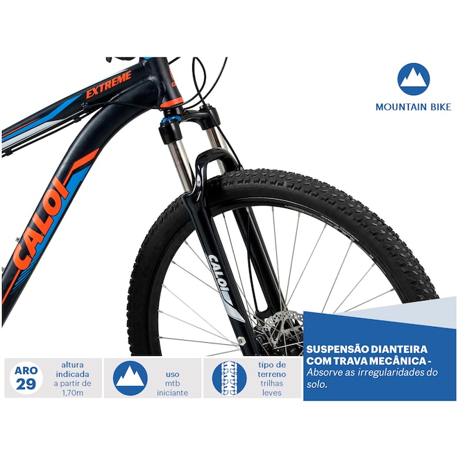 Indicada para os iniciantes em Mountain Bike, essa Bicicleta Caloi Aro 29 – 21 Marchas possui quadro leve em alumínio coma comodidade da suspensão dianteira com trava mecânica para absorver as irregularidades do solo. Seu trocador Shimano Easy Fire garante a troca de marchas de forma rápida e eficiente. A Caloi Extreme possui freio a disco mecânico que resulta em boa performance e baixa manutenção com câmbio Shimano otimizado pela tecnologia SIS (Sistema Indexado Shimano). Além disso, os pneus MTB são largos e garantem segurança e estabilidade nos terrenos irregulares. Não perca a oportunidade e tenha ótimos momentos com a qualidade Caloi. Confira o preço!