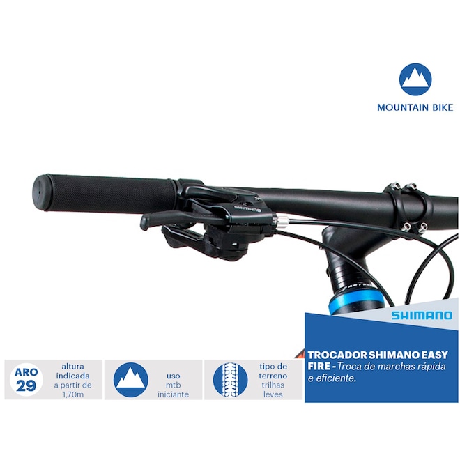 Tipo Mountain Bike Gênero Masculino Faixa Etária Adulto Aro 29 Peso Máximo Suportado (kg) 100 Quadro Alumínio 6061 Corrente KMC Raios Aro em Alumínio parede dupla Cubo Alumínio com Quick Release Cubo Traseiro Alumínio com Quick Release Pneus MTB Pedal Plástico Pedivela Aço Movimento de Direção Ahead Cassete/Roda Livre Roda Livre 7 Velocidades Câmbio Dianteiro Shimano TY Câmbio Traseiro Shimano TZ Guidão MTB Alavanca do Freio PVC Freio Dianteiro Disco Mecânico Freio Traseiro Disco Mecânico Selim MTB com grafismos Abraçadeira do Selim Alumínio com Quick Release Canote do Selim Alumínio com Carrinho Tamanho do Quadro 17 Marchas 21 Garantia do Fornecedor Contra Defeito de Fabricação SAC do Fornecedor CALOI: 0800 701 8022 e Grande São Paulo (11) 5853-2744 Conteúdo da Embalagem 1 Bicicleta Desmontada