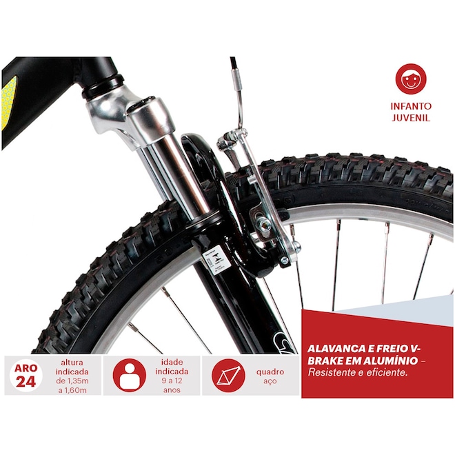 Com design moderno e quadro resistente em aço, a Bicicleta Caloi Max Front apresenta Aro 24, perfeita para as crianças entre 9 a 12 anos e altura aproximada de 1,35 a 1,60 metros. Com suspensão dianteira que proporciona suavidade em terrenos irregulares, a Bicicleta Caloi Aro 24 conta com alavanca e Freio V-Brake em alumínio para resistência, maior desempenho e segurança nos passeios urbanos. Seu selim com Quick Release é de fácil ajuste na altura do banco para comodidade durante o percurso. Não perca a chance e escolha a sua Caloi através do conteúdo especial que exemplifica detalhes específicos para a compra de sua bicicleta infantil. Aproveite para comprar!ref: 892808
