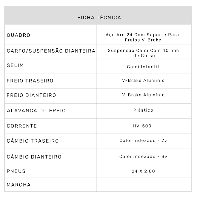 Ocasião de Uso Lazer / Mobilidade Gênero Unissex Faixa Etária Infantil Aro 24 Alavanca do Freio Plástico Freio Dianteiro V-Brake Alumínio Freio Traseiro V-Brake Alumínio Manopla Borracha Quadro Aço Aro 24 Com Suporte Para Freios V-Brake Garfo/Suspensão Dianteira Suspensão Caloi com 40 mm de curso Folha do Aro Alumínio Cubo Aço Cubo Traseiro Aço Pneus 24 x 2.00 Raios Inox Câmbio Dianteiro Caloi Indexado - 3v Câmbio Traseiro Caloi Indexado - 7v Passador / Alavanca de Câmbio Grip Shift Corrente HV-500 Pedivela EVERESTT - 152mm - 42/34/24 Movimento Central B887W Movimento de Direção FP-H532 Cassete/Roda Livre Roda Livre 07 velocidades - 14-28T Pedal Plástico Canote do Selim Aço 27.2 x 250mm - ajuste com quick-release Selim Caloi Infantil Guidão Aço Curvo Mesa/Suporte do Guidão Aço Garantia do Fornecedor Contra Defeito de Fabricação Conteúdo da Embalagem 1 Bicicleta Desmontada SAC do Fornecedor CALOI: 0800 701 8022 e Grande São Paulo (11) 5853-2744