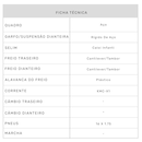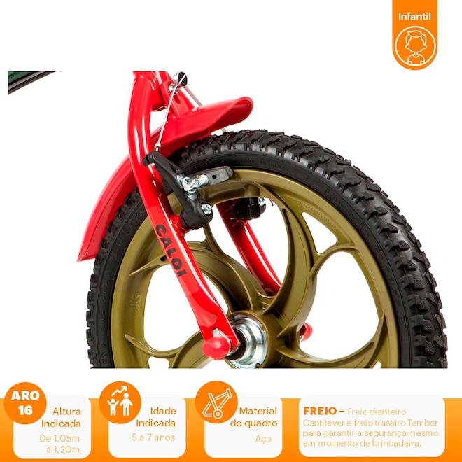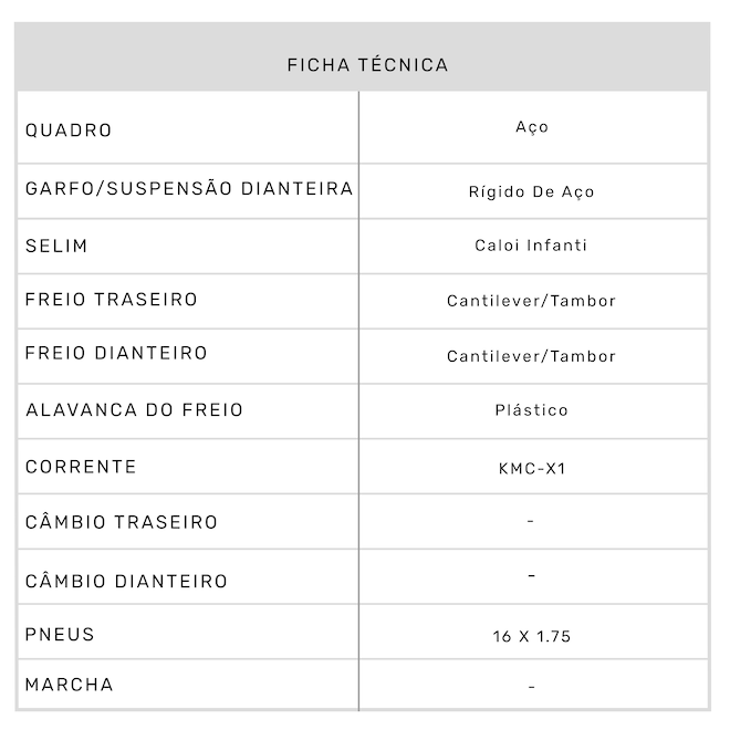 Ocasião de Uso Lazer / Mobilidade Gênero Unissex Faixa Etária Infantil Aro 16 Alavanca do Freio Plástico Freio Dianteiro Cantilever/tambor Freio Traseiro Cantilever/tambor Manopla Plástico Quadro Aço Garfo/Suspensão Dianteira Rígido de Aço Folha do Aro Plástico Cubo Acoplado à Roda Plástica Cubo Traseiro Acoplado à Roda Plástica Pneus 16 x 1.75 Corrente KMC-X1 Pedivela Monobloco Movimento Central Monobloco com Esferas Movimento de Direção Standard Cassete/Roda Livre Roda Livre 1 Velocidade com 20 Dentes Pedal Plástico Canote do Selim Aço Integrado ao Selim - Ajuste com Quick-Release Selim Caloi Infantil Guidão Aço Curvo Paralamas Dianteiro e Traseiro Peso Máximo Suportado (kg) 100 Garantia do Fornecedor Contra Defeito de Fabricação SAC do Fornecedor CALOI: 0800 701 8022 e Grande São Paulo (11) 5853-2744 Conteúdo da Embalagem 1 Bicicleta Desmontada
