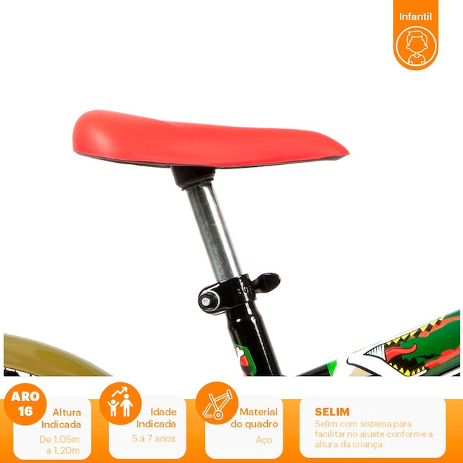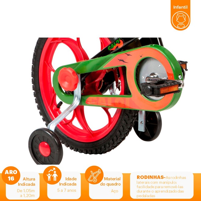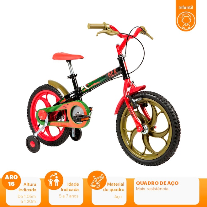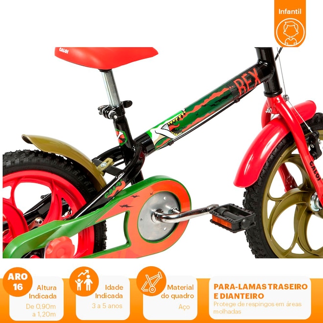 Estilosa e radical, a Caloi Power Rex Aro 16 é um excelente presente para a criançada explorar novos lugares com muita liberdade e diversão. Apresenta quadro e garfo resistentes em aço com freios Cantilever/tambor. O guidão em aço curvo possui manoplas plastificadas, seu selim é macio e o canote é ajustado por quick-release. Já as rodas possuem aros plastificados e coloridos para valorizar o design descolado da Bicicleta Caloi Infantil. Conta ainda com paralamas traseiro e dianteiro para a proteção dos respingos em áreas molhadas, cobre-corrente, além de rodinhas laterais que oferecem um maior apoio e estabilidade nos primeiros percursos. Sua certificação INMETRO confere o padrão de segurança e qualidade. Não perca a chance de proporcionar aos baixinhos ótimos momentos de lazer e entretenimento. Compre já!ref: 951847
