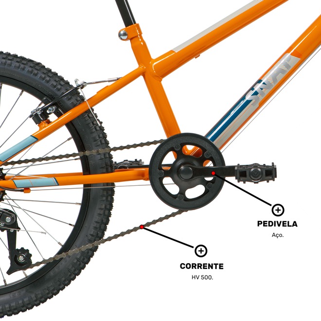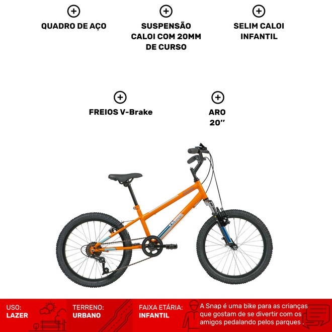 Com guidão em aço e freios V-Brake, a Caloi Snap Aro 20 possui manoplas emborrachadas para firmeza e aderência, câmbio traseiro Caloi com transmissão de 7V e trocadores Shift Lever para mais facilidade e rapidez nas trocas. Já o selim Caloi é anatômico.