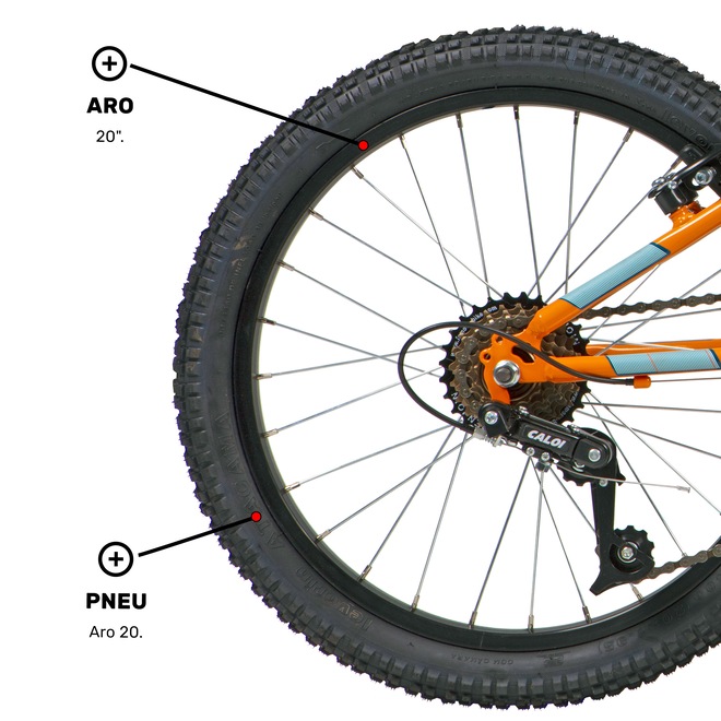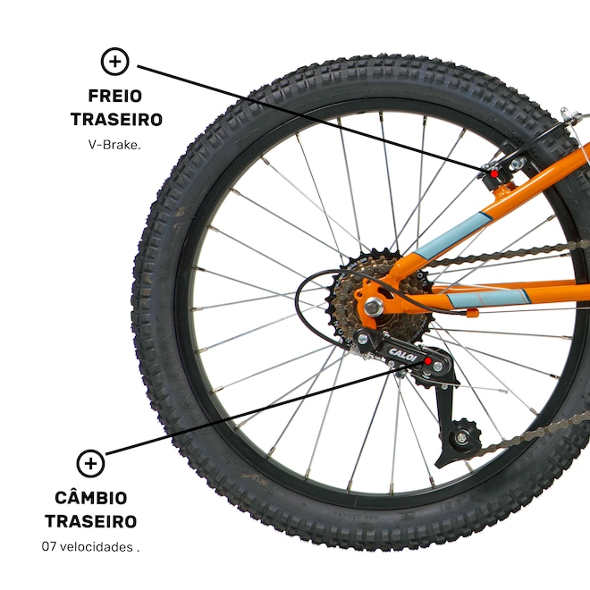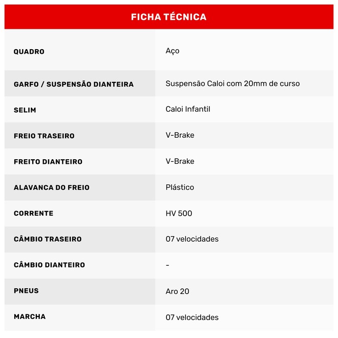 Lazer / MobilidadeFaixa Etária Infantil Aro 20 Alavanca do Freio Plástico Manopla Borracha Garfo/Suspensão Dianteira Suspensão Caloi com 20 mm de curso Folha do Aro Alumínio Cubo Aço Cubo Traseiro Aço Raios Zincado Passador / Alavanca de Câmbio Shift Lever Corrente HV-500 Movimento de Direção Standard Pedal Plástico Selim Caloi Infantil Guidão Aço Mesa/Suporte do Guidão Integrado com o Guidão Conteúdo da Embalagem 1 Bicicleta Desmontada SAC do Fornecedor CALOI: 0800 701 8022 e Grande São Paulo (11) 5853-2744 Quadro Aço Pedivela Aço Movimento Central Neco Cassete/Roda Livre 07 Velocidades Freio Dianteiro V-Brake Freio Traseiro V-Brake Canote do Selim Aço Marchas 7 Garantia do Fornecedor 3 meses nos demais componentes