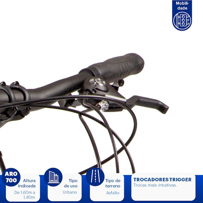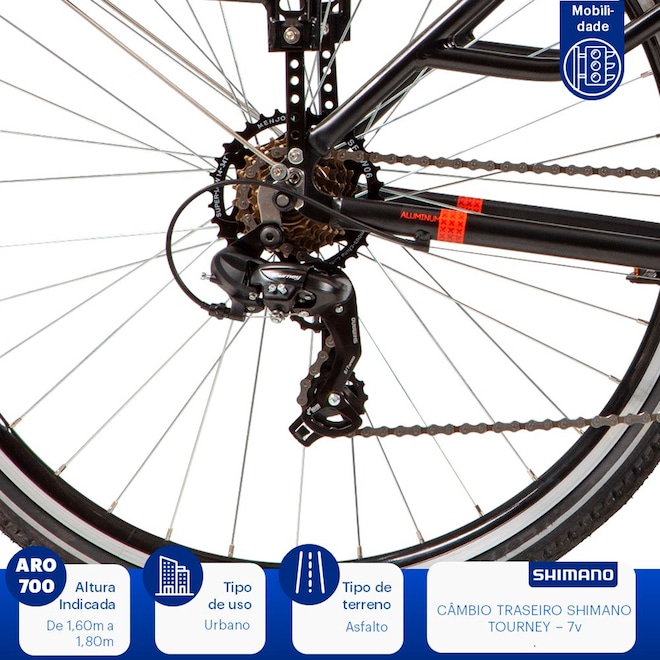 Seu quadro é leve em alumínio, guidão em aço com manoplas ergonômicas e freios V-Brake, de fácil ajuste e menos manutenção, câmbio traseiro Shimano Tourney 7V e passadores de marchas Trigguer para trocas mais intuitivas.