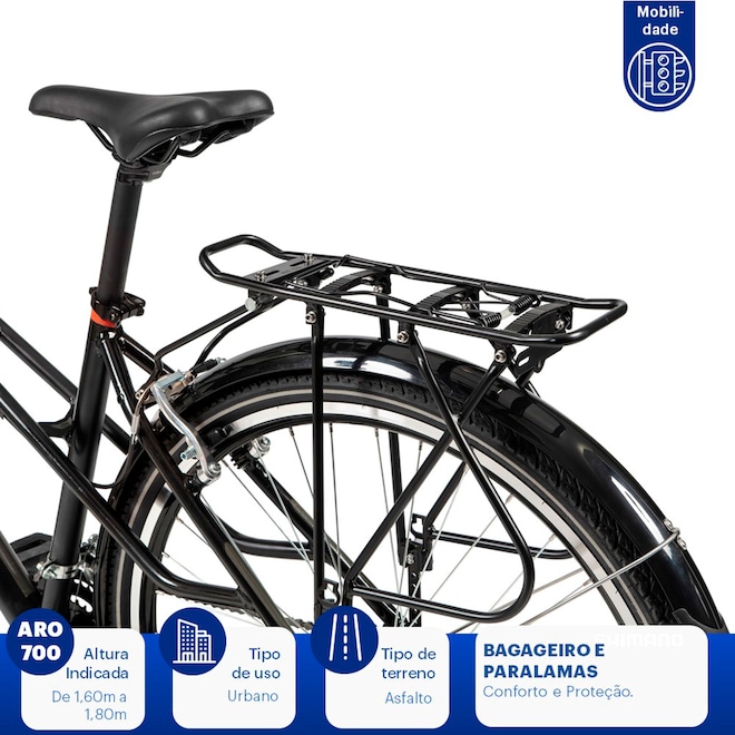 O selim da Urbam 700 21 Marchas é DDK regulável, conta com paralamas que ajudam a evitar respingos e bagageiro para facilitar o transporte de pequenos objetos.