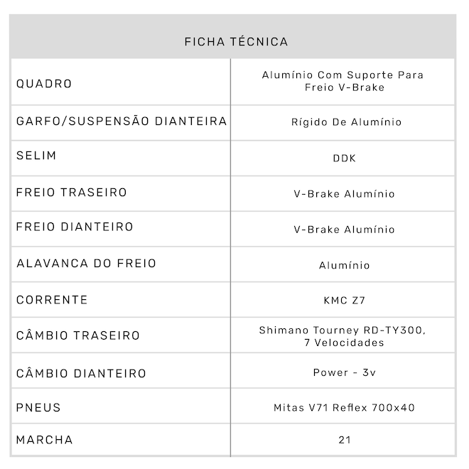 Tipo Urbana Ocasião de Uso Lazer / Mobilidade Gênero Unissex Faixa Etária Adulto Marchas 21 Alavanca do Freio Alumínio Freio Dianteiro V-Brake Alumínio Freio Traseiro V-Brake Alumínio Manopla Velo Quadro Alumínio com Suporte para Freio V-Brake Garfo/Suspensão Dianteira Rígido de Alumínio Folha do Aro Aro 700 - 36F - Parede Dupla Cubo Aço 36F com Quick Release Cubo Traseiro Aço 36F com Quick Release Pneus Mitas V71 Reflex 700x40 Raios Inox Câmbio Dianteiro Power - 3v Câmbio Traseiro Shimano Tourney RD-TY300, 7 velocidades Passador / Alavanca de Câmbio Trigger - 3v e 7v Corrente KMC Z7 Pedivela Aço - 170 mm - 3v - 42/34/24 Movimento Central Feimin Movimento de Direção Feimin Cassete/Roda Livre Roda livre 7 velocidades 14-34D Pedal Plástico Canote do Selim Alumínio 27.2x350mm - ajuste com Quick Release Selim DDK Guidão Aço 640 mm Mesa/Suporte do Guidão Alumínio - 75mm 6° Peso Máximo Suportado (kg) 100 Garantia do Fornecedor Contra Defeito de Fabricação Conteúdo da Embalagem 1 Bicicleta Desmontada SAC do Fornecedor CALOI: 0800 701 8022 e Grande São Paulo (11) 5853-2744 Aro 700