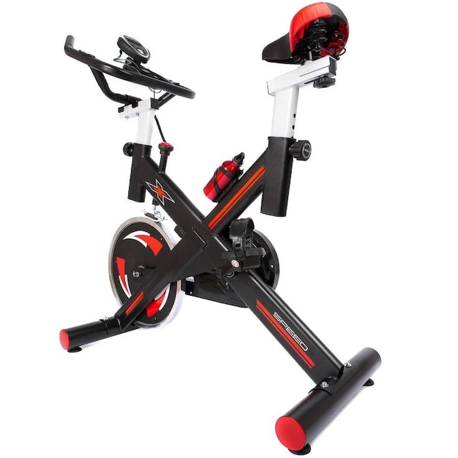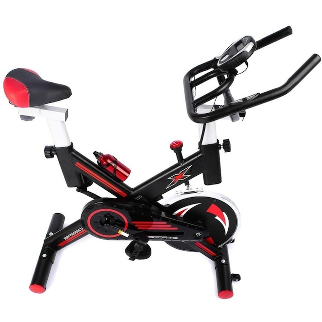 Treine com assento acolchoado, guidão emborrachado com diferentes tipos de pegada, ajuste na cinta de ajuste para os pés e sistema de regulagem para assento e guidão e suporte para água.
