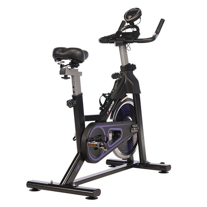 A Spinning Kikos F2i é um equipamento residencial e oferece intensidade e variedade para treinos aeróbicos em casa. Simula percursos desafiadores e queima até 500 calorias em 45 minutos. Indicada para iniciantes e intermediários, possui assento e guidão ajustáveis para conforto e cintas nos pedais para estabilidade durante o exercício.