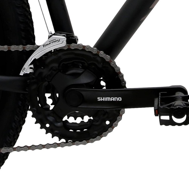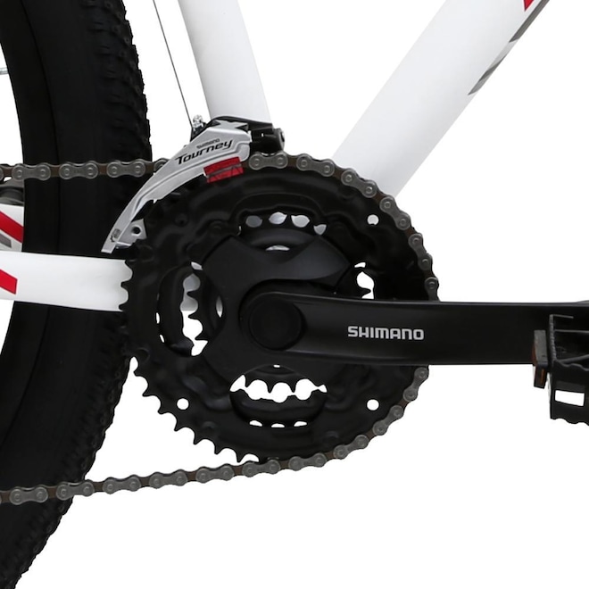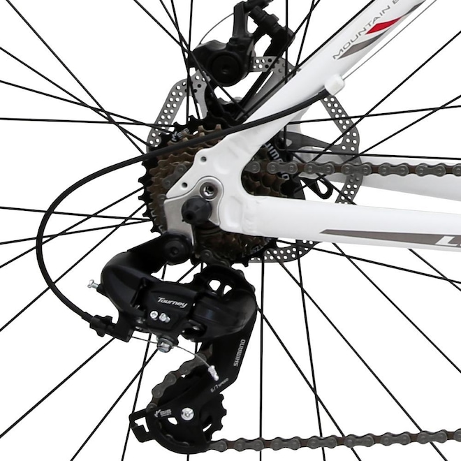 Produzida com materiais residentes e de ótima durabilidade, possui 21 velocidades incríveis, freio a disco mecânico, suspensão em aço, quadro de alumínio.