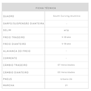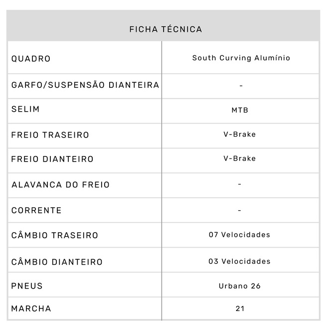 Tipo Urbana Gênero Unissex Faixa Etária Adulto Aro 26 Marchas 21 Freio Dianteiro V-Brake Freio Traseiro V-Brake Manopla Borracha Raios Aro em Alumínio parede dupla Pedivela Triplo de Aço Pedal MTB - Nylon Canote do Selim Alumínio Selim MTB Guidão Alumínio Peso Máximo Suportado (kg) 100 Garantia do Fornecedor Contra Defeito de Fabricação Ocasião de Uso Urbana Quadro South Curving Alumínio Pneus Urbano 26 Câmbio Traseiro 07 Velocidades Câmbio Dianteiro 03 Velocidades Cassete/Roda Livre 07 Velocidades Conteúdo da Embalagem 1 Bicicleta Desmontada