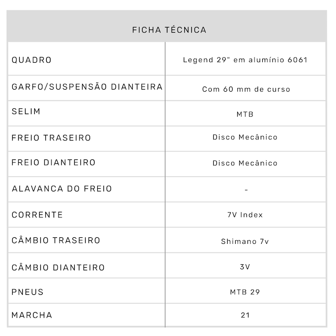 - Gênero - Unissex - Faixa Etária - Adulto - Aro - 29 - Selim - MTB - Garantia do Fornecedor - Contra Defeito de Fabricação - Cassete/Roda Livre - 7V Index - Freio Dianteiro - Disco Mecânico - Freio Traseiro - Disco Mecânico - Tipo - Mountain Bike - Conteúdo da Embalagem - 1 Bicicleta Montada - Marchas - 21 - Garfo/Suspensão Dianteira - Com 60 mm de curso - Pneus - MTB 29 - Pedivela - Triplo de Aço - Folha do Aro - Aero Alumínio Parede Dupla - Guidão - MTB Alumínio - Cubo Traseiro - Alumínio com Blocagem - Cubo - Alumínio com Blocagem - Mesa/Suporte do Guidão - Alumínio - Câmbio Traseiro - Shimano 7v - Câmbio Dianteiro - 3V - Quadro - Legend 29" em alumínio 6061 - Abraçadeira do Selim - Alumínio com Blocagem - Canote do Selim - Alumínio com blocagem rápida - Corrente - 7V Index - Passador / Alavanca de Câmbio - Rapid Fire 7V - SAC do Fornecedor - SOUTHBIKE: (51) 3077-3010 ou atendimento@southbike.com.br - Ocasião de Uso - Treino
