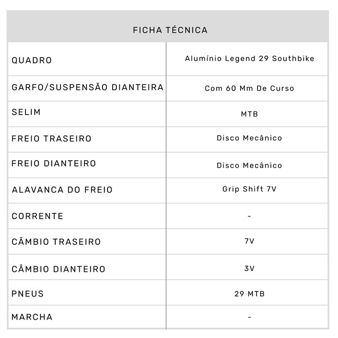 MontanhaFaixa Etária Adulto Aro 29 Alavanca do Freio Grip Shift 7V Freio Dianteiro Disco Mecânico Freio Traseiro Disco Mecânico Quadro Alumínio Legend 29 Southbike Garfo/Suspensão Dianteira Com 60 mm de curso Folha do Aro Aero Alumínio Parede Dupla Pneus 29 MTB Câmbio Dianteiro 3V Câmbio Traseiro 7V Pedivela Triplo de Aço Cassete/Roda Livre Roda Livre 7 Velocidades Selim MTB Abraçadeira do Selim Alumínio 31.8 com Blocagem Rápida Guidão MTB Aço Mesa/Suporte do Guidão MTB Alumínio SAC do Fornecedor SOUTHBIKE: (51) 3077-3010 ou atendimento@southbike.com.br Garantia do Fornecedor Contra Defeito de Fabricação Conteúdo da Embalagem 1 Bicicleta Desmontada Peso Máximo Suportado (kg) 100