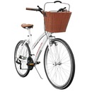 Bicicleta adulta feminina aro 26 com 21 velocidades, quadro em alumínio, pneu com faixa branca, guidão com regulagem de altura e cesta removível.