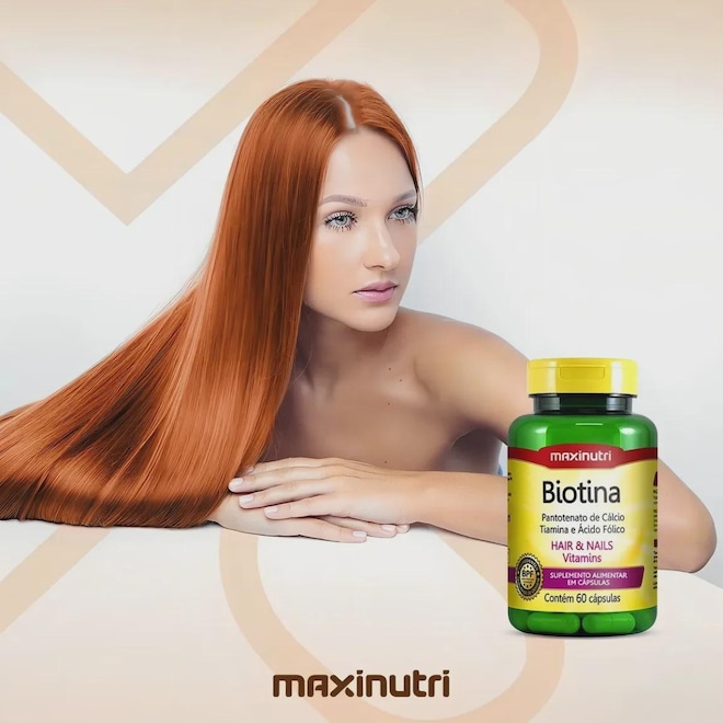 Biotina Maxinutri em cápsulas para suplementação nutricional diária. Produto em frasco com 60 porções, indicado para adultos. Suplemento dietético que auxilia a complementar dietas insuficientes, devendo ser utilizado conforme orientação de profissional de saúde.