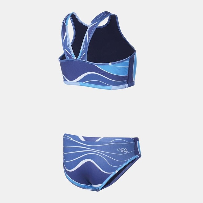 O Biquini Crooped Sunshine, da linha KidSplash, possui proteção UV50+ e uma linda estampa ondulada colorida. É produzido em poliéster e elastano. Possui alça larga nas costas e forro interno.