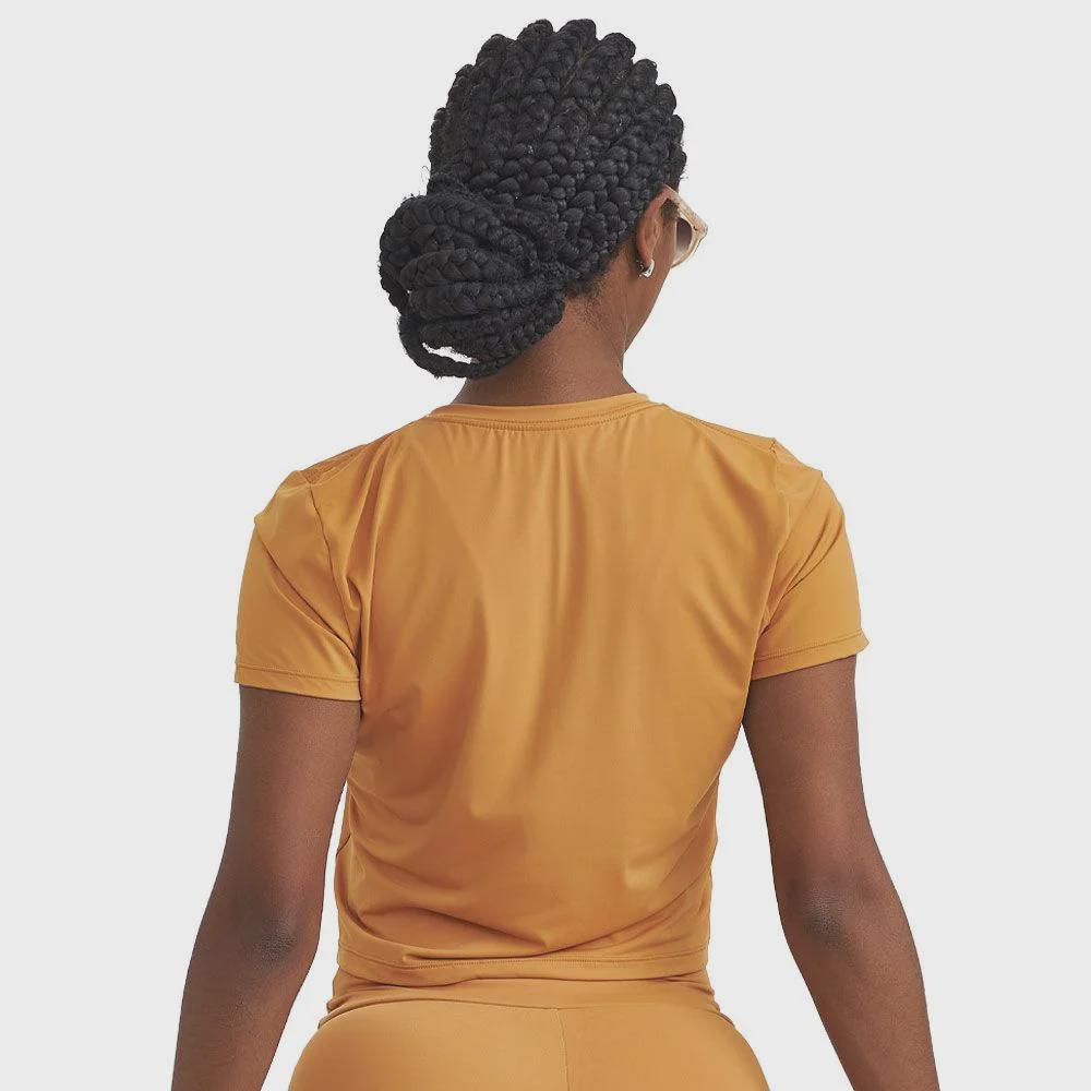 Nome: Cropped Caju Brasil Origem: Nacional Tecido predominante: 92% Viscose e 8% Elastano Cor predominante: Caramelo Indicado para: Treino e Dia a Dia Peso: 110g (Referente ao tamanho M)