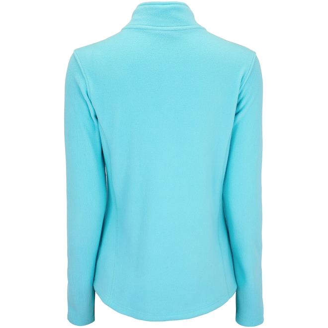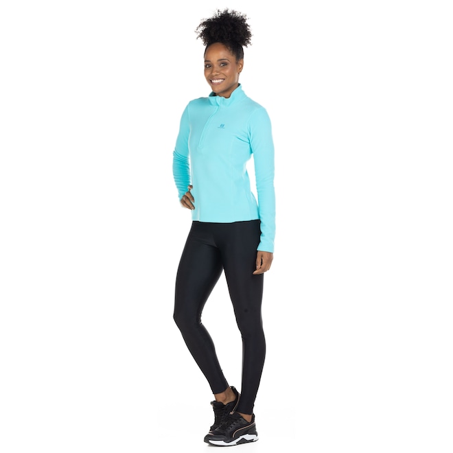 A blusa Polar ½ tem gola alta com ajuste frontal por zíper, sua barra traseira tem corte arredondado e tecido em poliéster.