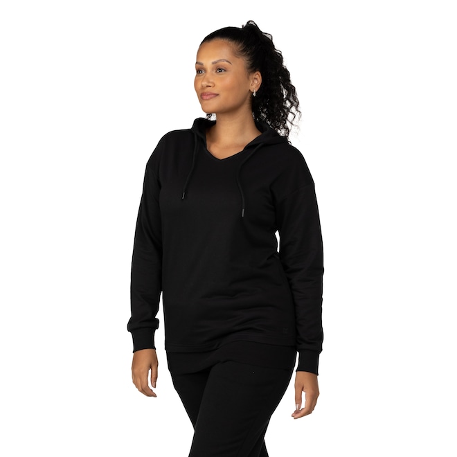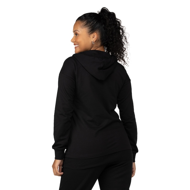 Sem forro, possui malha macia e de ótimo caimento, barra e punhos canelados, além de um prático capuz ajustado por cordão.