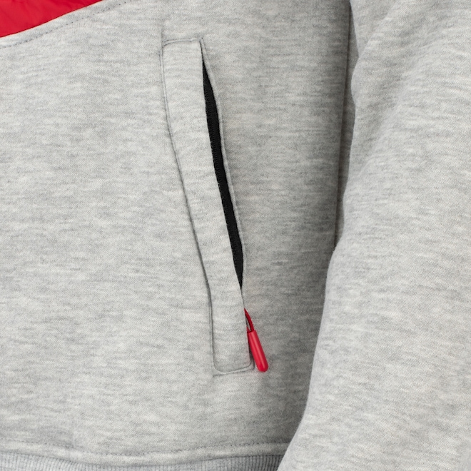 Já a gola é alta, bolsos frontais para carregar seus objetos com mais segurança, punhos e barra com elástico para oferecer melhor ajuste ao corpo e fechamento frontal com zíper, o que possibilita um ajuste personalizado.