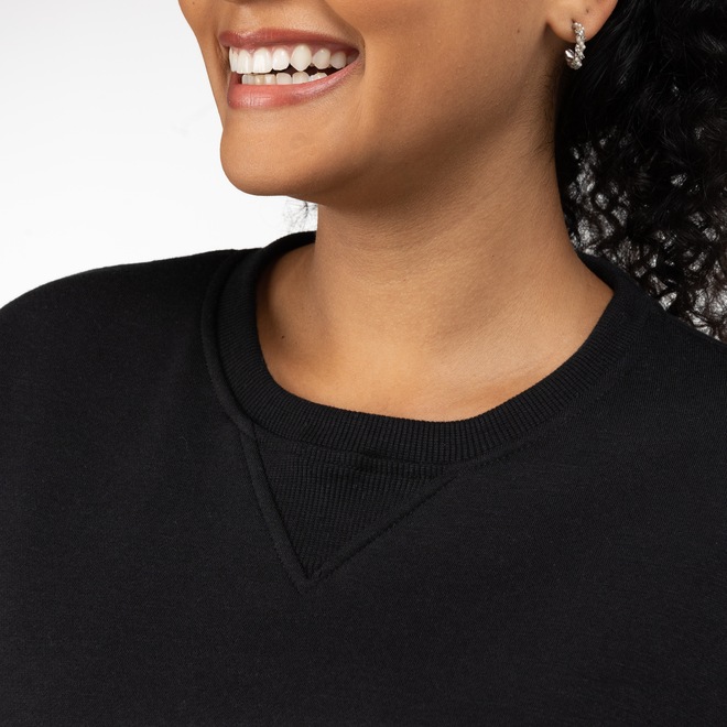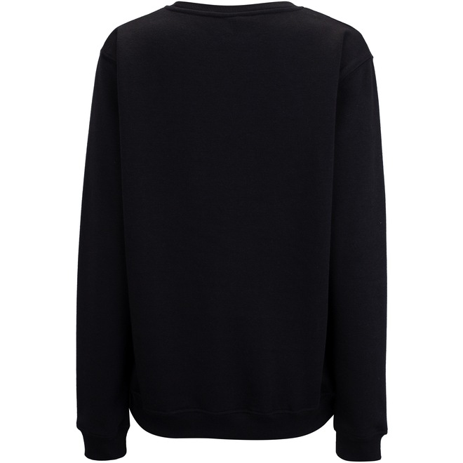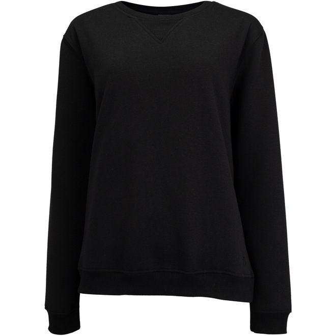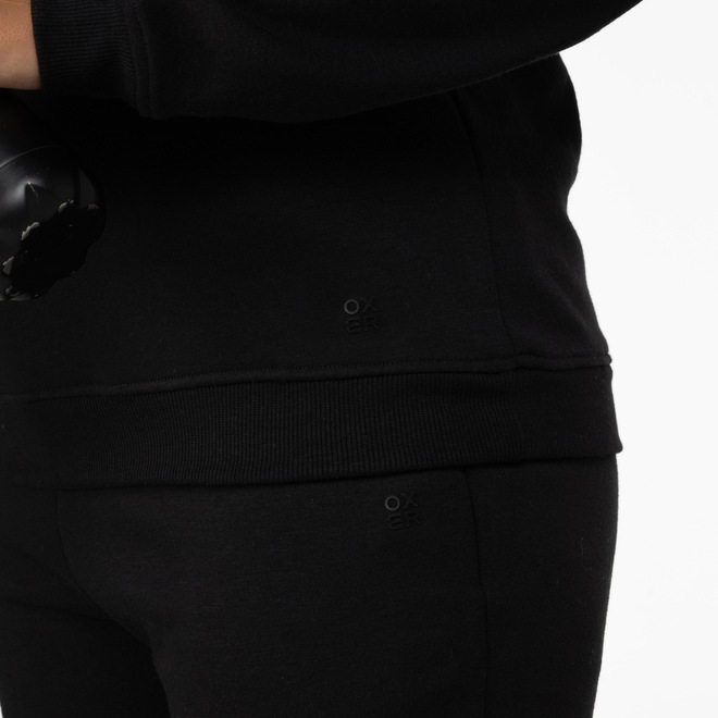 A blusa possui gola careca e punhos canelados, possibilitando um ajuste personalizado.
