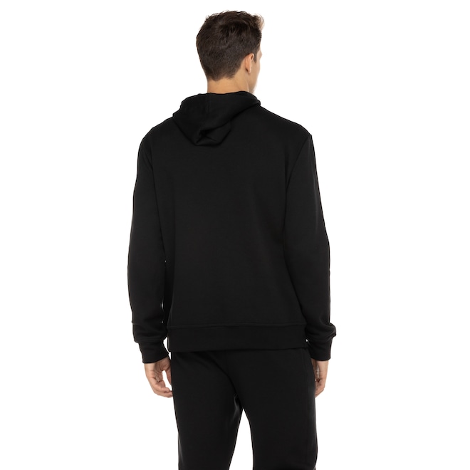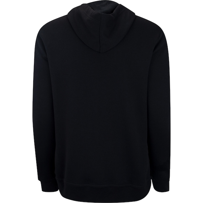 Possui bolso canguru, forro é levemente flanelado e seu capuz tem ajuste em cordão.
