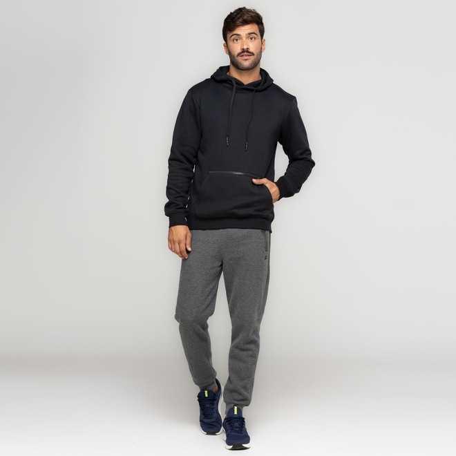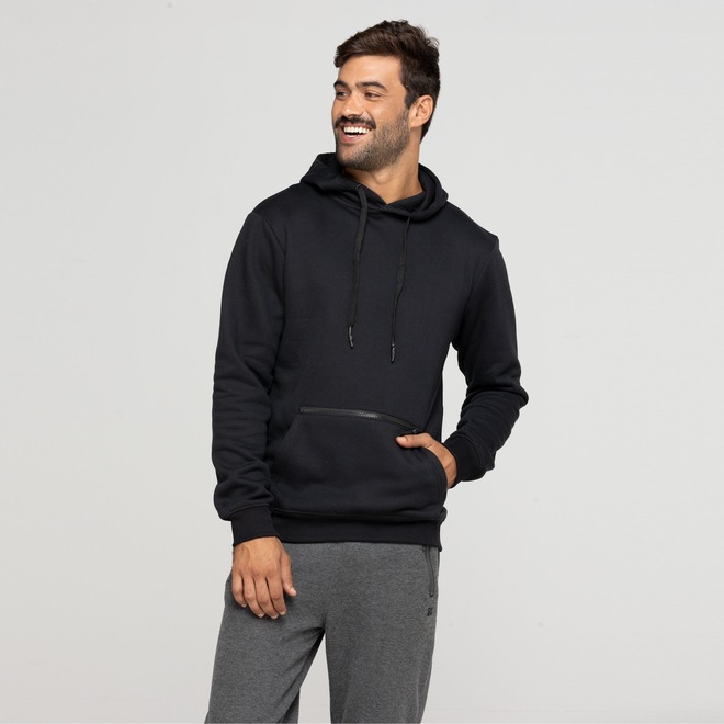 Conta ainda com dois bolsos, um em zíper e outro estilo “canguru” para esquentar as mãos em dias frios, e capuz ajustado por cordão.