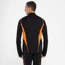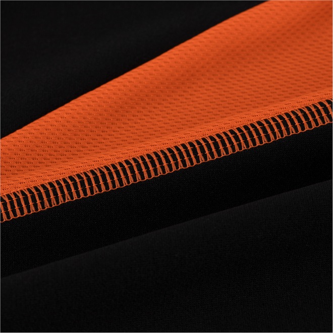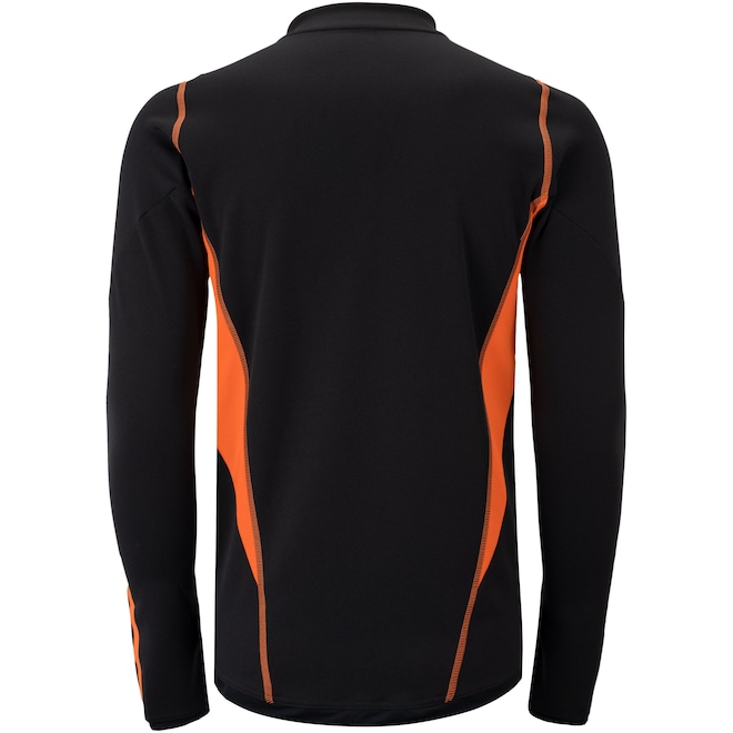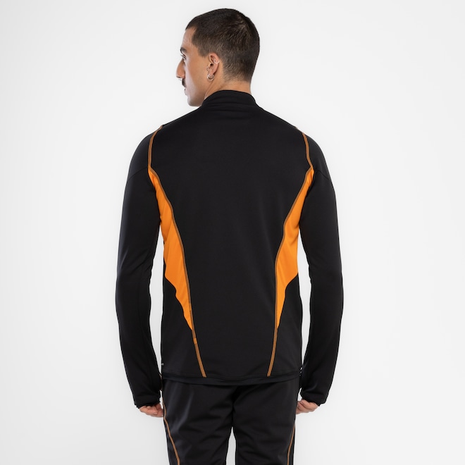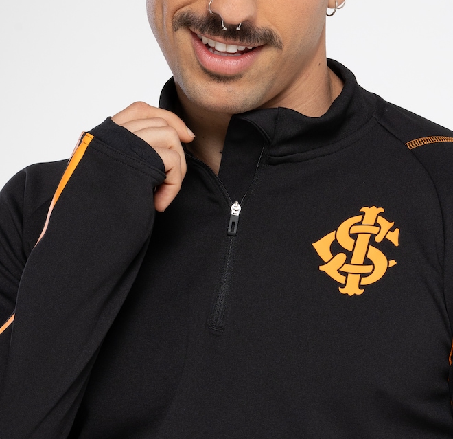 Sua gola é alta e canelada ajustada por zíper frontal, além de aberturas para polegar que ajudam a evitar a subida das mangas, além de proteger as mãos em dias mais frios.