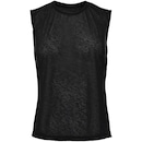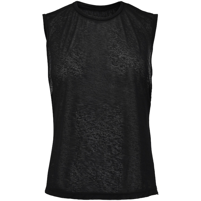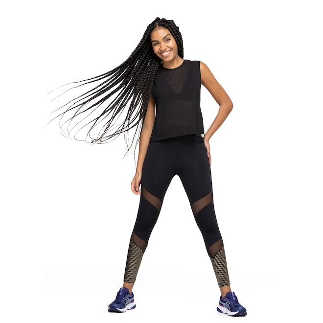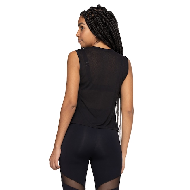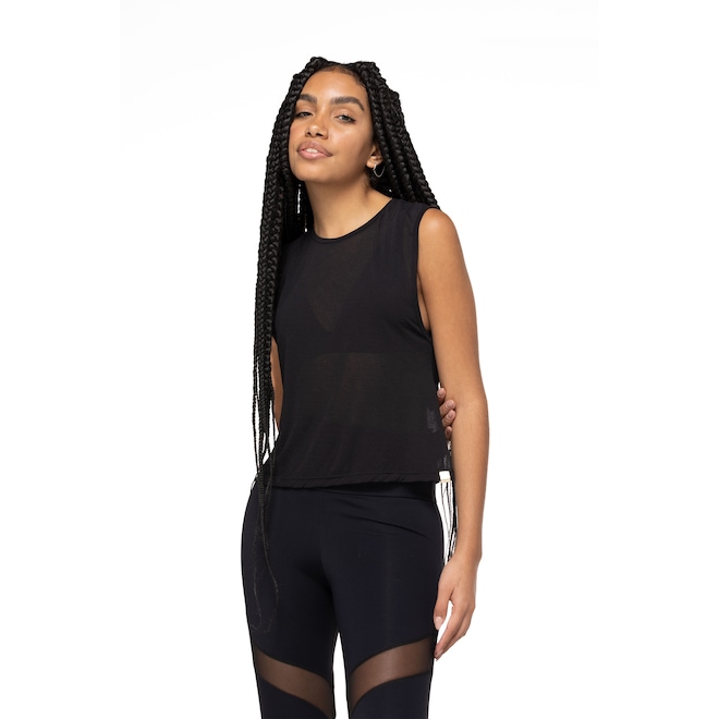 De leve transparência, possui amplas cavas que facilitam a mobilidade dos movimentos, perfeita para sobrepor um top fitness que oferece mais sustentação durante os exercícios.