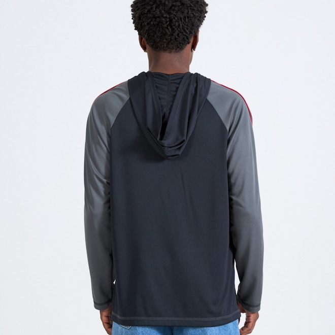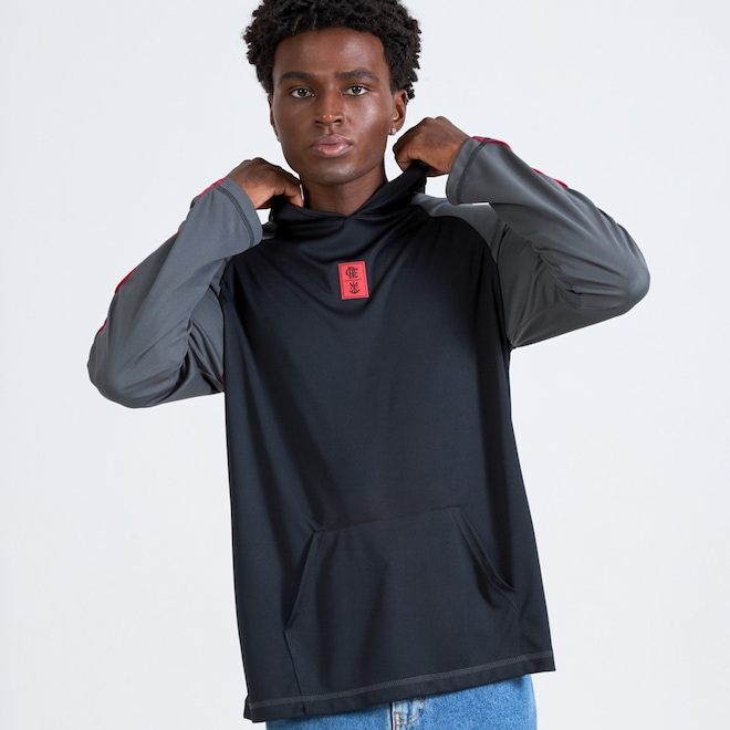 O moletom é predominantemente preto, com mangas cinzas e detalhes em vermelho do logo do flamengo. Com bolso frontal e capuz. Essa é uma peça ideal para os momentos de frio e quem é apaixonado pelo Mengão.