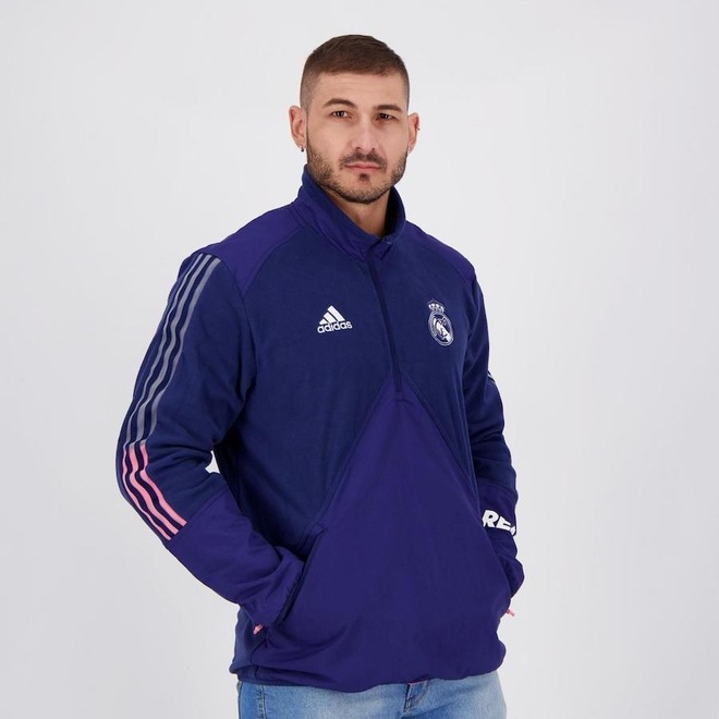 Por isso, a adidas criou esta blusa de fleece de viagem para vestir os jogadores do Real Madrid enquanto cruzam a Espanha e todo o continente.