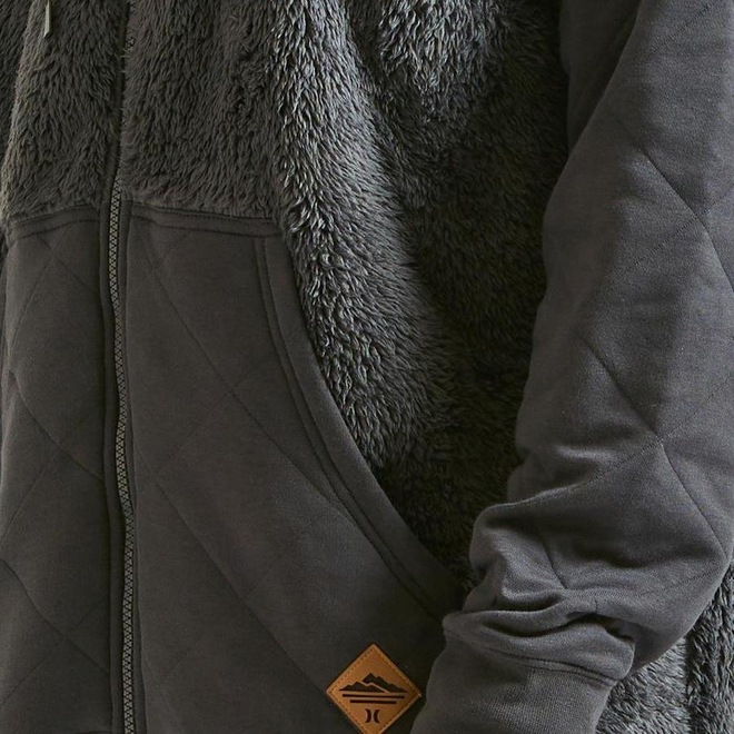 Blusa Hurley Especial importada, parte superior, moletom matelassê e imperior sherpa "alta", bolso no peito com zíper e bolso canguru com etiqueta de material não natural.