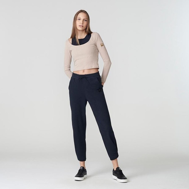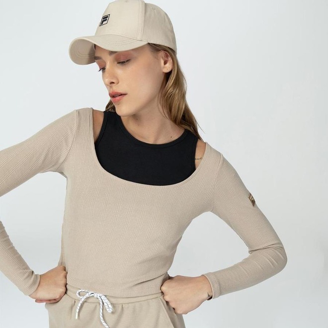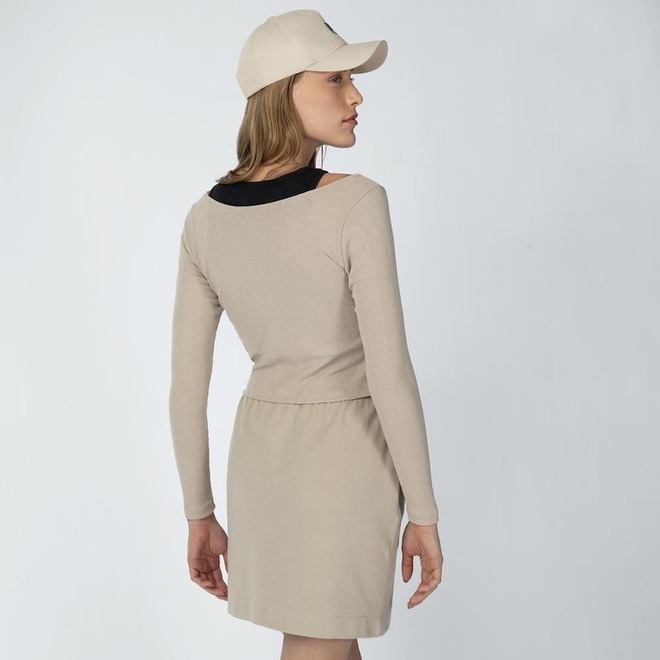 Ela é confeccionada em tecido de algodão com elastano e sobreposição em tecido canelado, que oferece leve elasticidade para a peça.