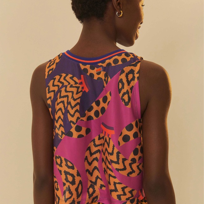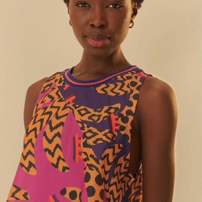 Com sua estampa tropical inspirada na natureza brasileira, esta regata traz toda a energia e alegria das cores e formas da flora brasileira.