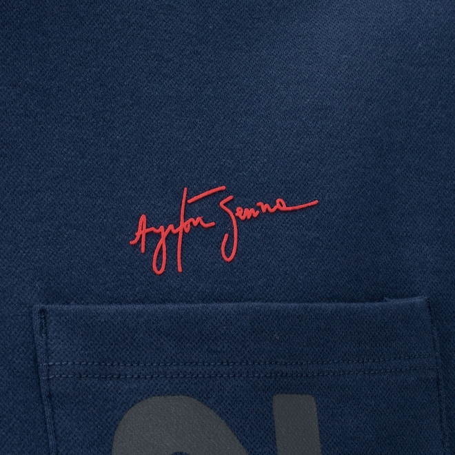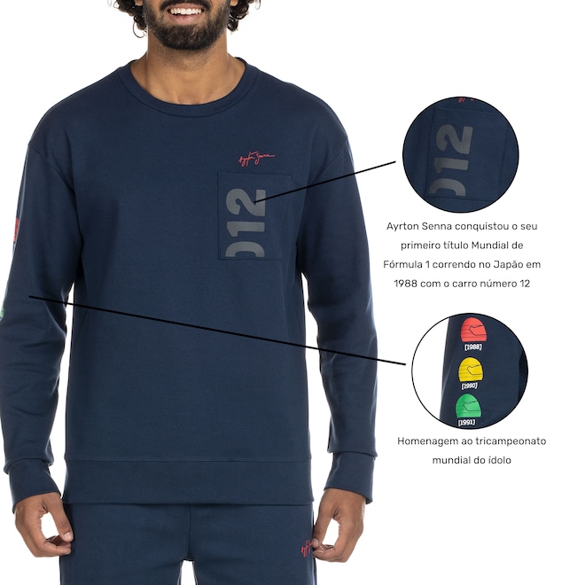Além disso, o Blusão tem detalhes que homenageiam, em seu bolso, o primeiro mundial disputado por Senna em 1988 com o carro nº12, e em sua manga o tricampeonato mundial.