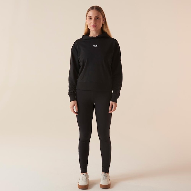 Blusão feminino confeccionado em moletinho leve de algodão com poliéster. Modelagem comfort, mais solta no corpo, com capuz transpassado e manga longa. Possui punhos e barra em ribana, cabas deslocadas para baixo e bordado FILA Linear centralizado na parte frontal superior.