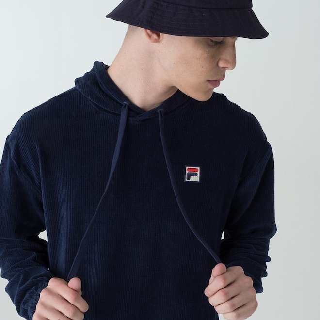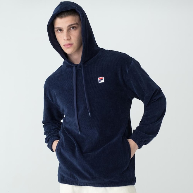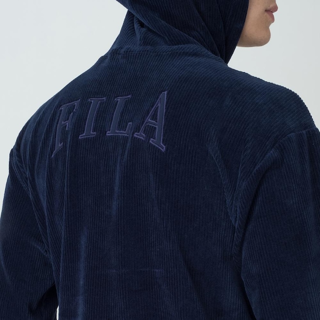 Blusão com capuz masculino confeccionado em malha cotelê de algodão, poliéster e elastano. Modelagem comfort, mais solta no corpo, com manga longa. Possui capuz com cadarço personalizado ajustável e forro em meia malha premium de algodão, barra e punhos com elástico interno, bolsos frontais, patch F-Box aplicado na parte frontal esquerda superior e maxi logo Fila Letter estilizado em aplique de tecido centralizado na parte traseira superior.