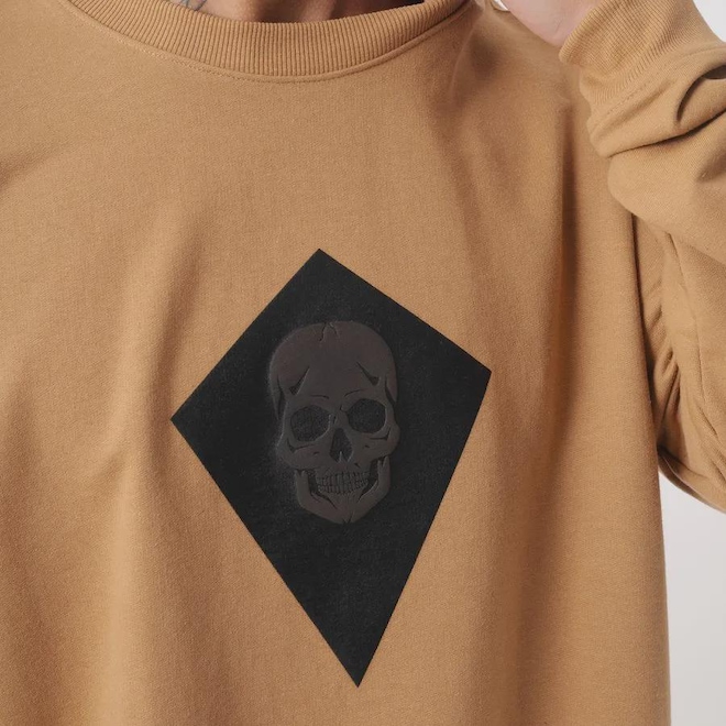 · Estampa frontal em plastisol prensado + relevo na caveira.