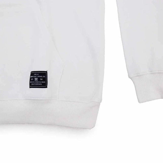 Moletom Dc Shoes fechado 275g, com estampa frontal, cordão de ajuste com ponteira de metal personalizada e etiquetas personalizadas.