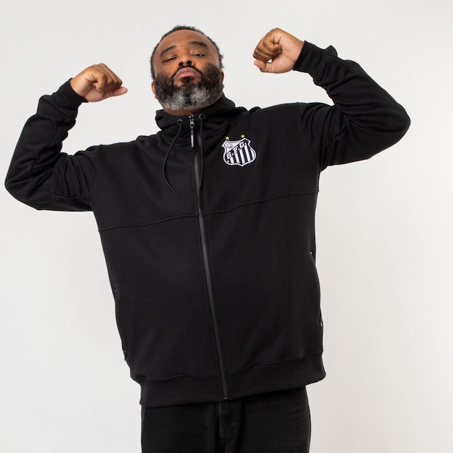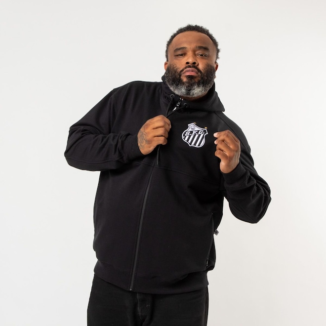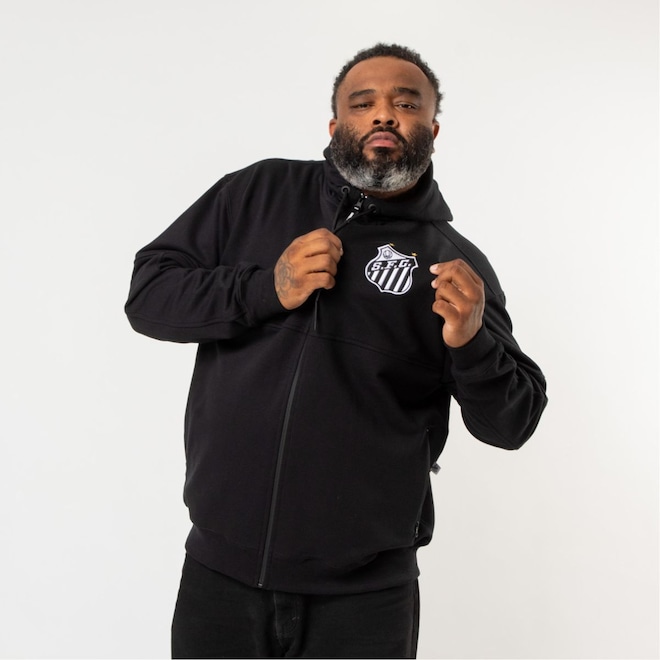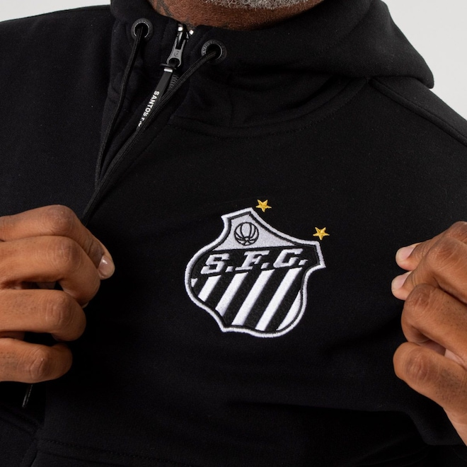 O escudo do Santos é bordado no lado esquerdo do peito, agregando um detalhe visual discreto à peça.
