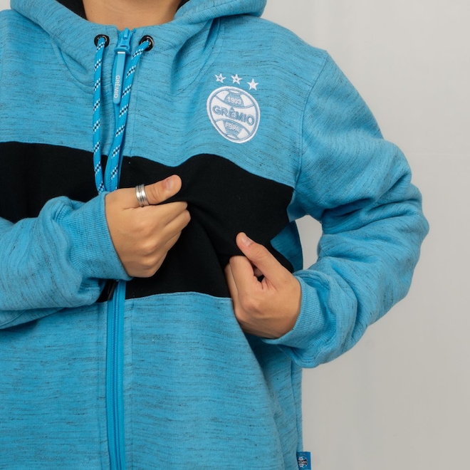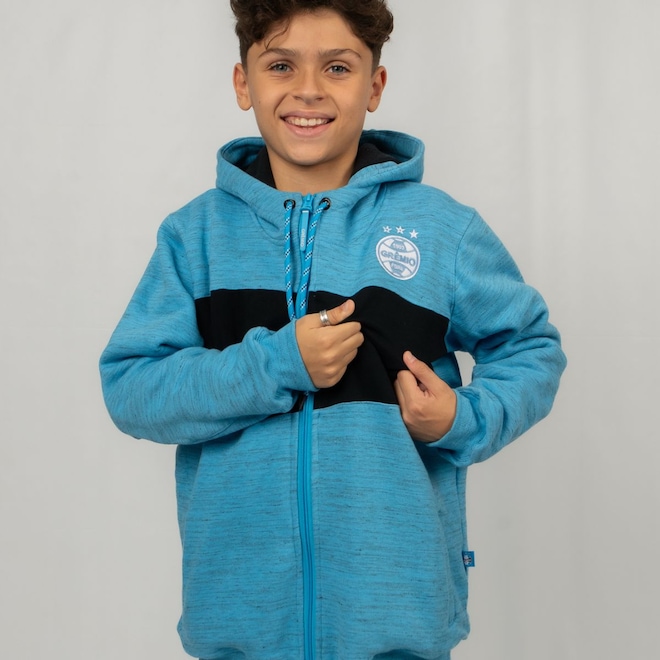 Este moletom juvenil do Grêmio é ideal para os dias mais frios, oferecendo aconchego e praticidade. Possui design aberto com zíper frontal e bordado discreto no peito, com acabamento de alta qualidade.