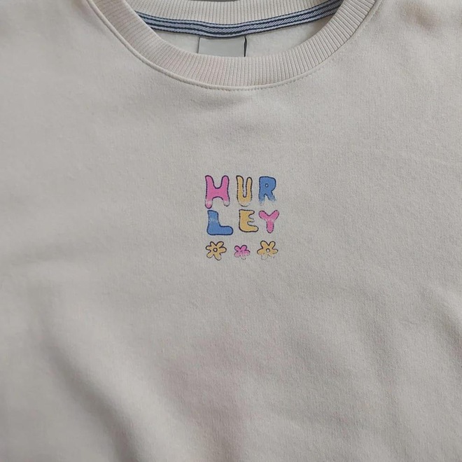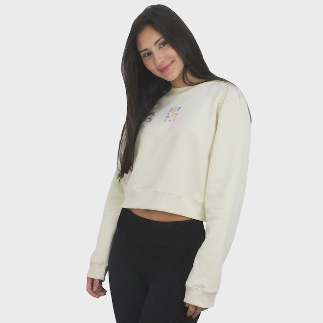 O Moletom Hurley Flower Off White é produzido em moletom flanelado 240g 75% Algodão e 25% Poliéster, modelagem cropped. Estampa exclusiva Hurley Flower em silk no peito e acabamento com etiqueta personalizada na lateral.