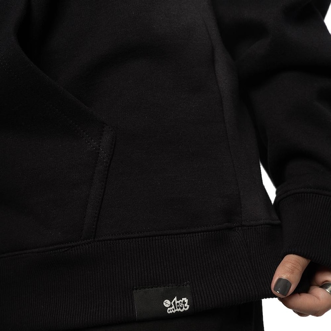 Moletom Lost com capuz, felpado, estampa frontal e etiquetas personalizadas.