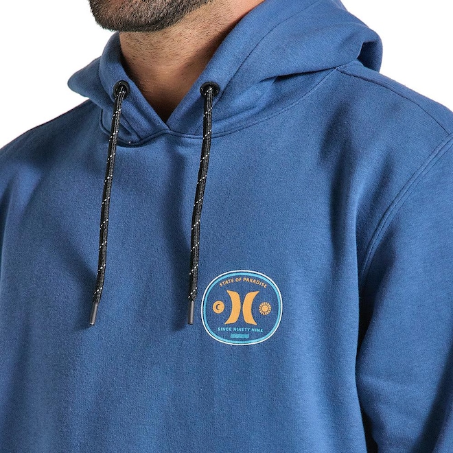 Moletom Hurley com estampa frente e costas, capuz com cordão, bolso canguru com etiqueta e etiquetas personalizadas.